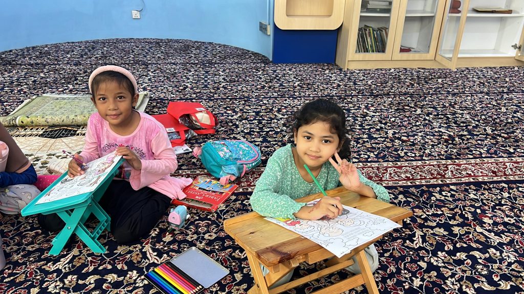 Sekitar jam 11 pagi, Azra masuk ke Surau PAWE bersama rakannya Aishah untuk menyertai pertandingan mewarna. Mereka mewarna sambil bermain dan berbual dengan rakan-rakan baharu. Melihat Azra begitu selesa, saya ambil peluang berjumpa kenalan dan melihat acara-acara lain.